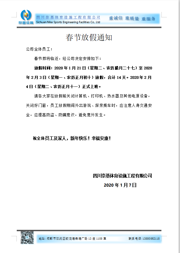 关于奈基体育春节放假通知